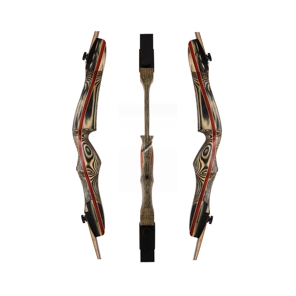 Our Hero risers are made from an attractive combination of dark, smoky Actionwood with hard maple and padouk accent stripes. This appealing combination of beautiful woods gives our Hero risers a special, classic look. In order to accomodate the needs of various traditional archer’s preferences we have designed our Hero risers to allow either shooting off the shelf