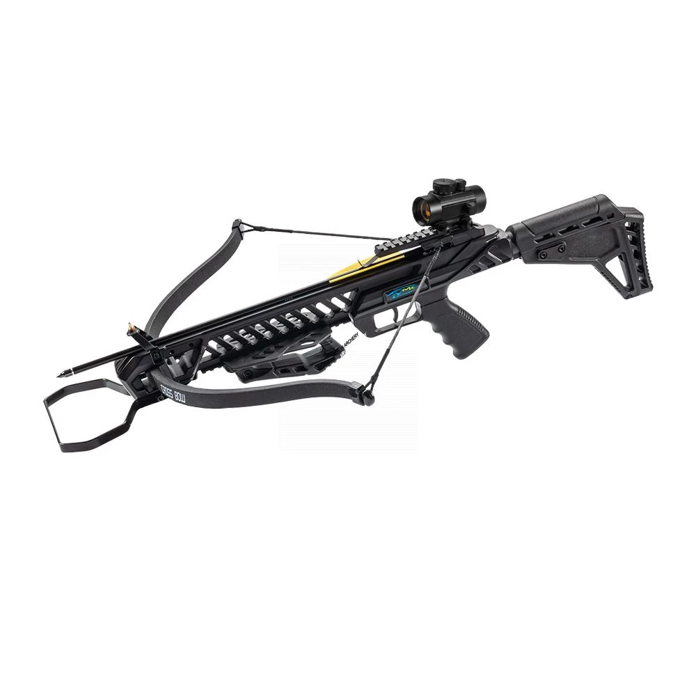 The stock is also adjustable so that the length of the crossbow can vary between 78 and 82 cm. For safe and accurate shooting, this MK-XB27GODC is equipped with an automatic safety and an adjustable sight.